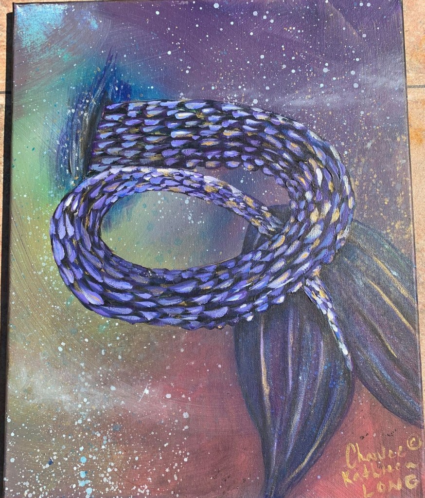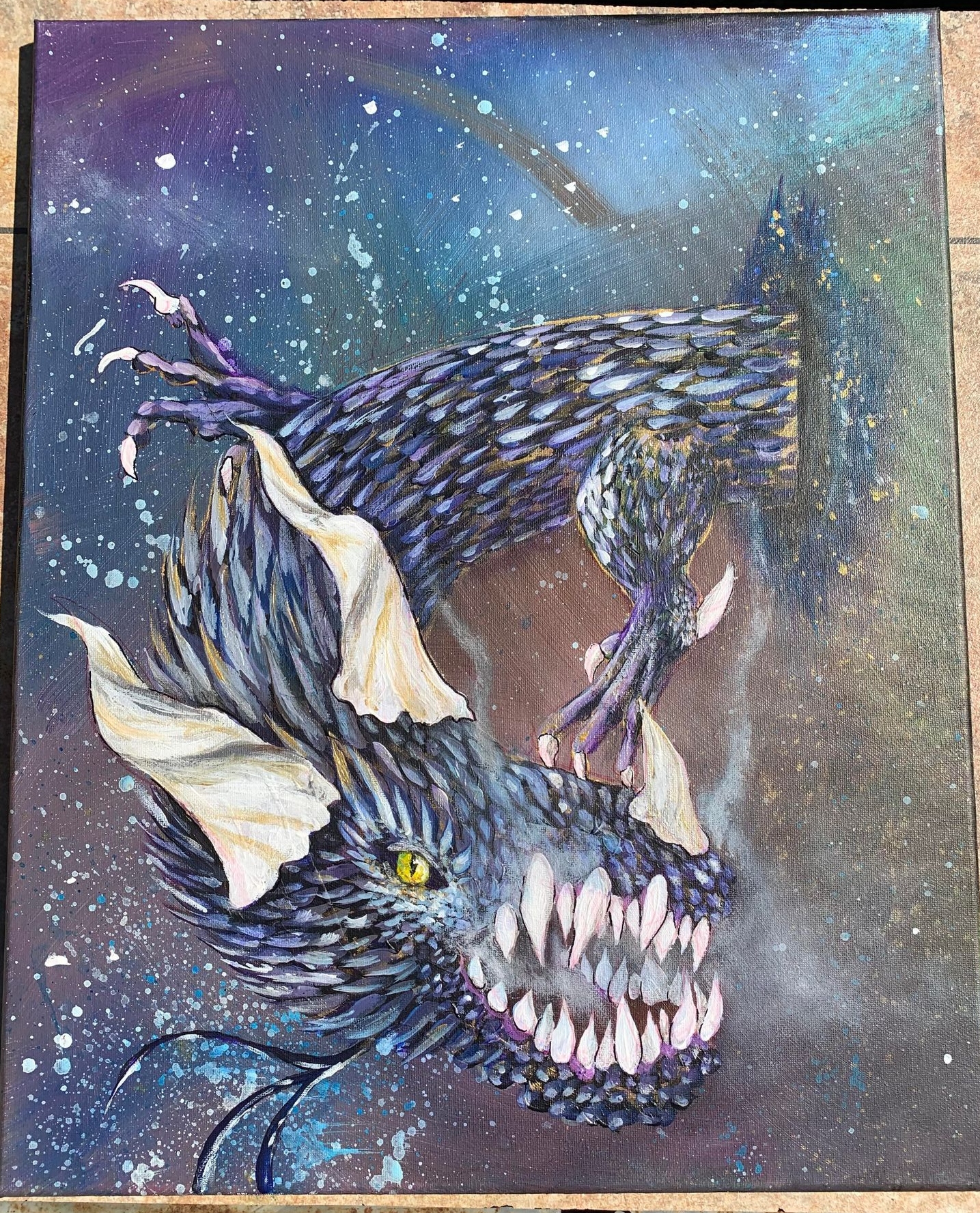 This matching pair of paintings is acrylic on two vertical 16×20 canvases. This mystical dragon is teleporting through a celestial background from one canvas to the next. It is primarily purple but for metallic silver and gold that catches the light as you walk by.