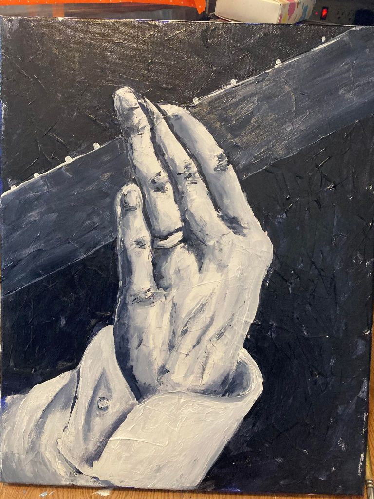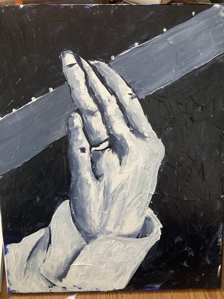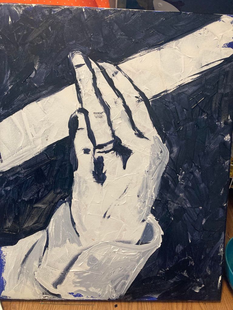 It looks like a hand! I had room for improvement on the shapes but it was a good start. I liked the blue undertones of the payne’s grey better than the tube black, so I mostly used it. Occasionally I would mix the pure black in for dark places. I needed to go over the background again as well as start shading the hand!