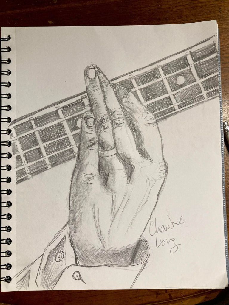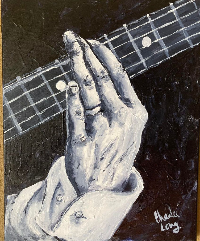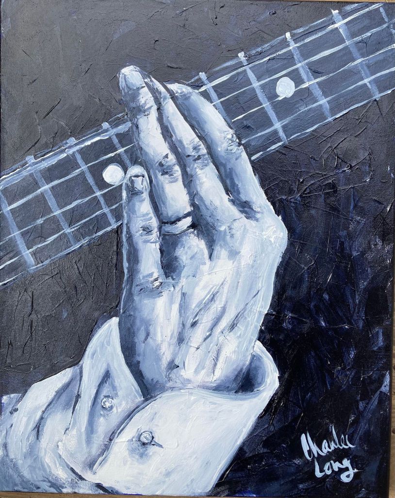 This is the reference image I decided on and I simplified it for better composition. The subject was the hands and I wanted to focus on that. Hands can be difficult to render so I wanted to be prepared before I ever put paint to canvas! I began sketching the hands and guitar. Many erasings later I had a decent sketch!