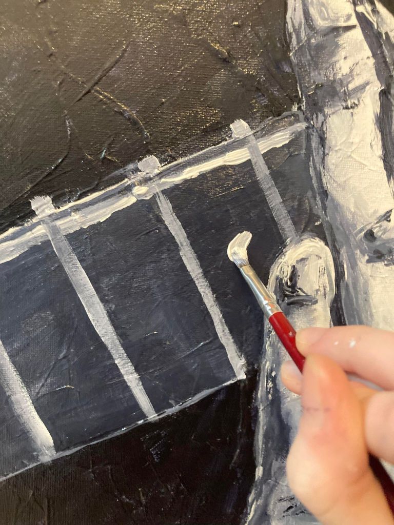 A little shading goes a long way! Contrast always adds to a painting, which is easy to do in black and white. I let this dry completely before going back in and continuing the shading. I fixed the shape of the hand a little and gave depth to the fingers. In the reference image, the musician has a ring and I wanted to include that but in a simplified way.
