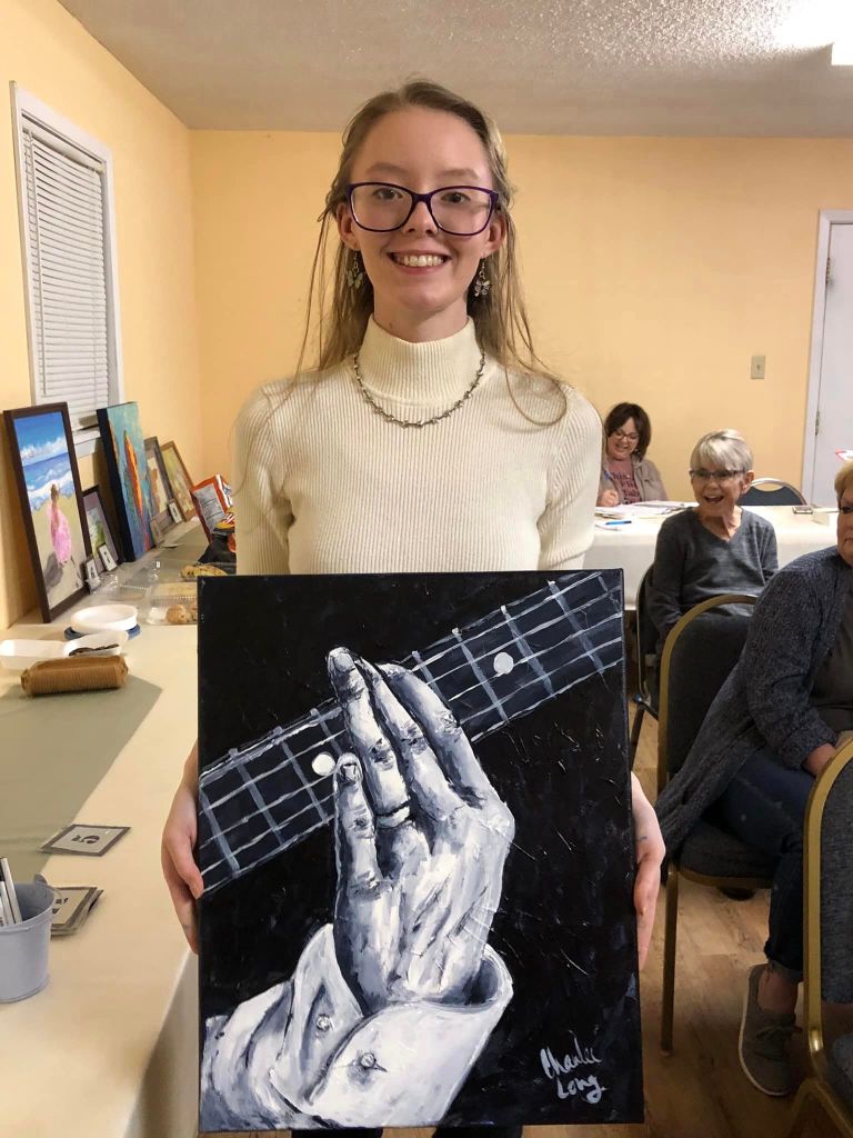 The finished product looks a lot different depending on the lighting! The payne’s grey has blue undertones and I loved how it was a bit deeper than plain black/white. This painting looks so different than my usual colorful works but it was so refreshing to do! I will definitely be dabbling in black and white again. I finished this piece just in time for 903 Artisans monthly meeting on February 7th. I brought mine for artist of the month and placed second!